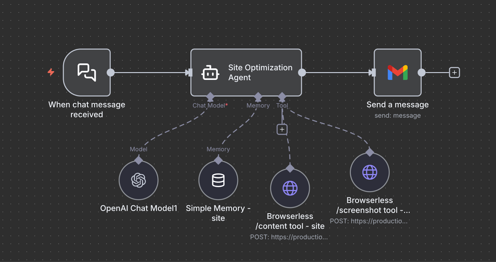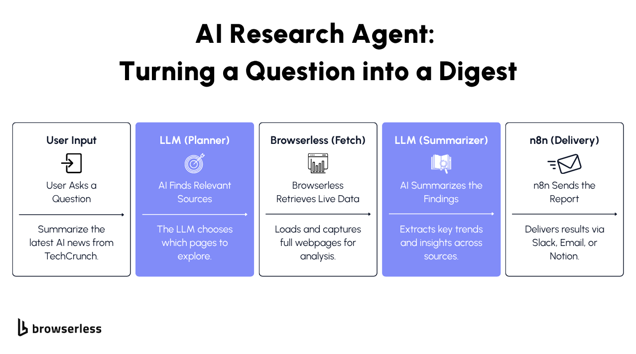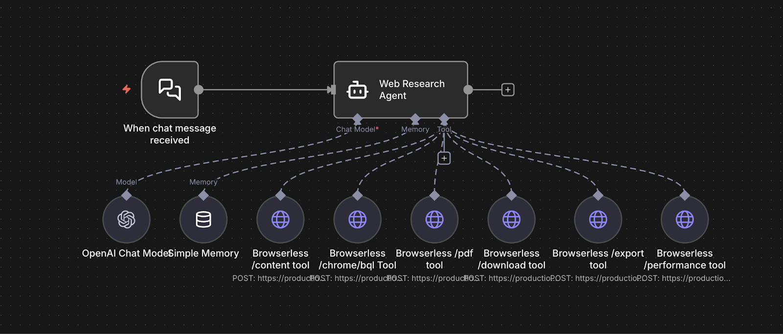 n8n handles orchestration, it connects user input, LLM reasoning, Browserless tool calls, scheduling, memory, and delivery into one workflow. It lets you trigger agents on chat, cron, or webhooks and route results to Slack, Notion, email, databases, or APIs without writing backend glue code.