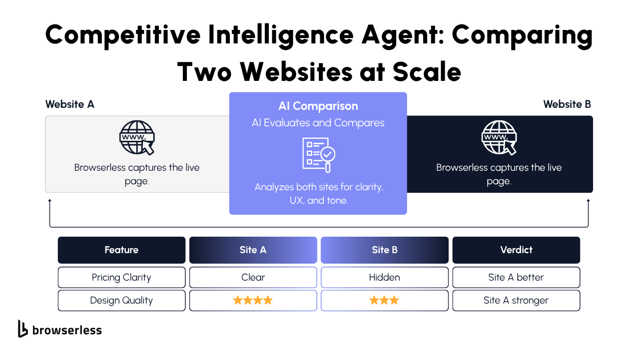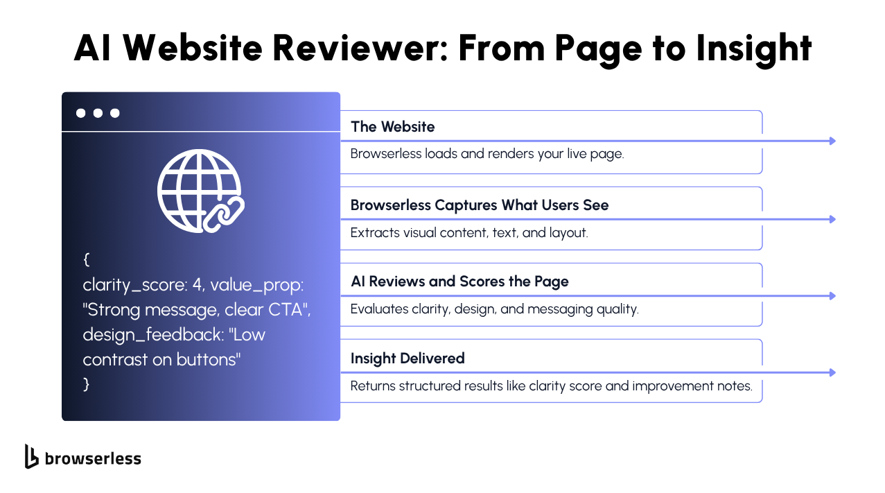 Rather than relying on a single data source, the agent selectively uses Browserless capabilities to collect both written content and visual context. It may read rendered page text to understand messaging, capture screenshots to evaluate layout and visual emphasis, or interact with the page to reveal additional sections when needed. This gives the agent the same signals a human reviewer would use, not just raw markup.