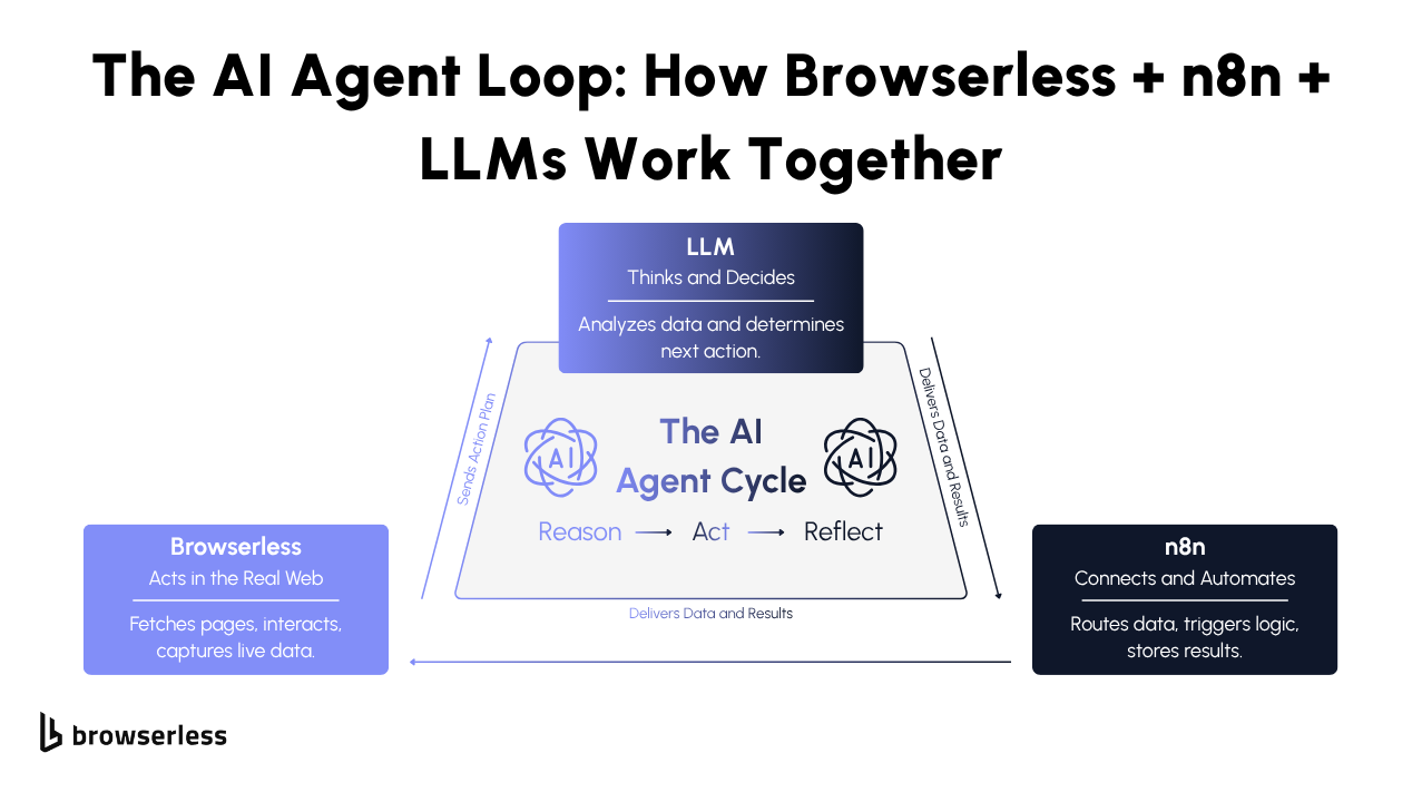 AI agents work best when their reasoning, actions, and evaluations are clearly separated. n8n coordinates each step, while Browserless handles the real browser work, creating a predictable loop the LLM can reason through.