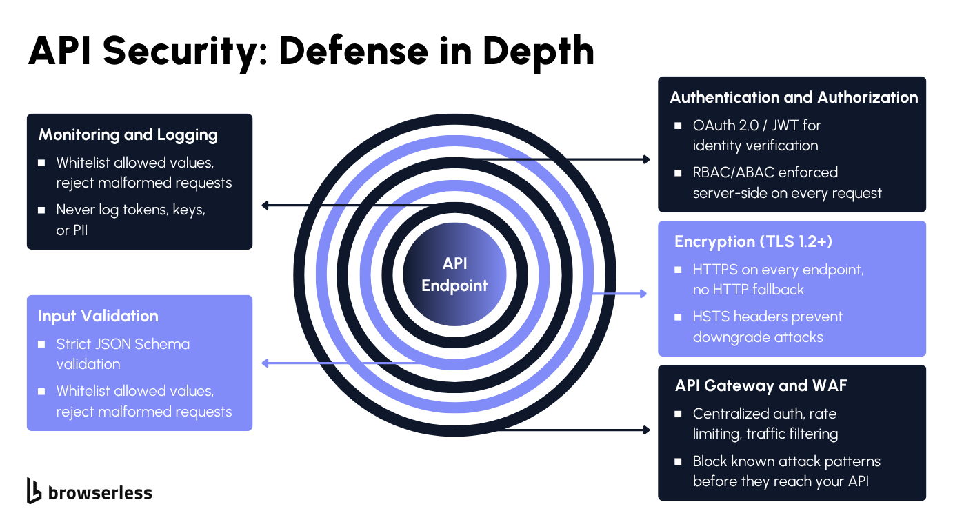 Every API you expose is a surface attackers will probe, and roughly 80% of successful API attacks come from authenticated users exploiting missing object-level authorization checks. The difference between a secure endpoint and a breached one usually comes down to whether authorization is properly verified on every request. This guide covers the full OWASP API Security Top 10, the defenses that actually work, and how Browserless applies them to secure browser automation at the API level.