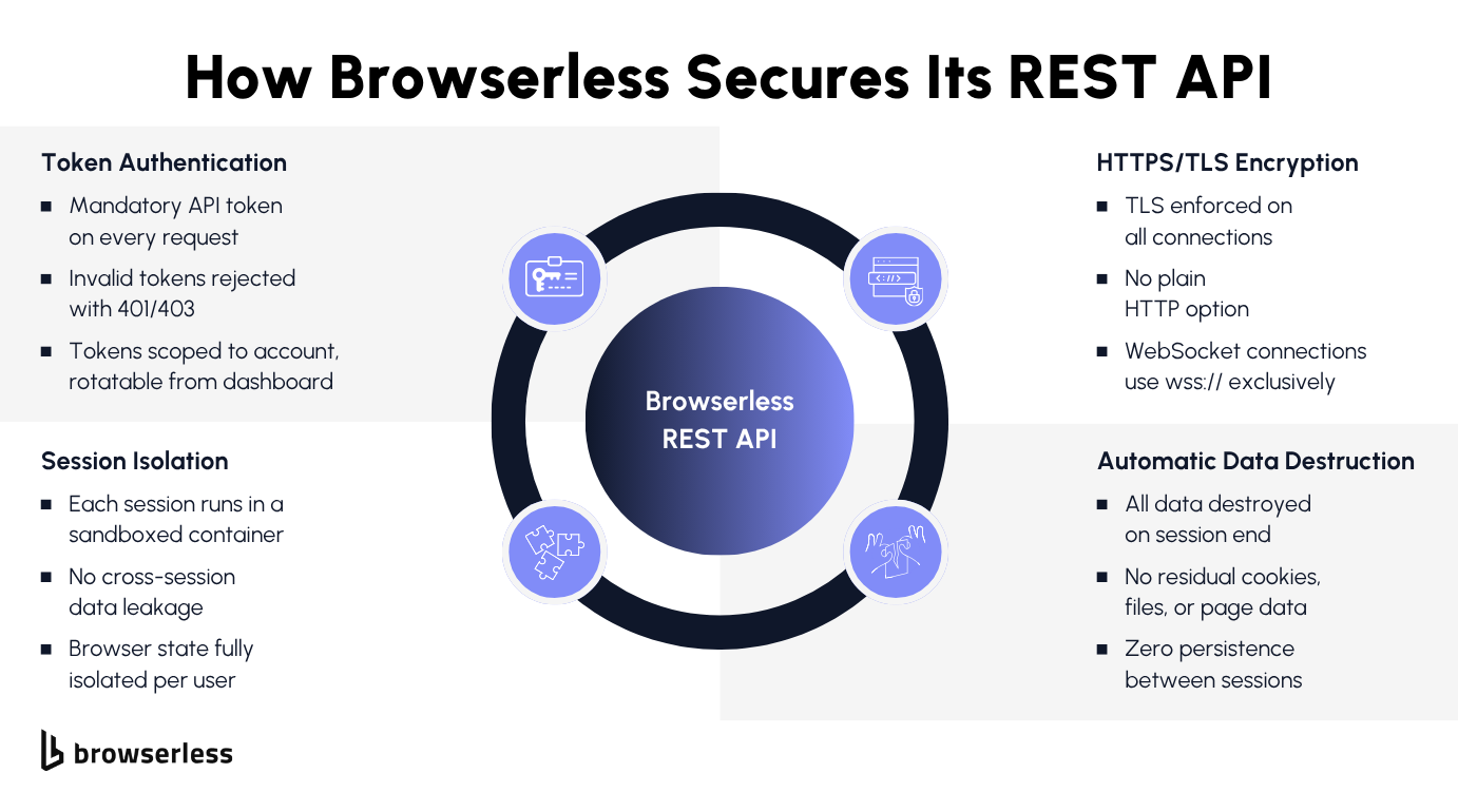 - Browserless security. Mandatory token authentication, HTTPS-only connections, isolated browser sessions, and automatic teardown of browser state after every stateless request on the REST API.