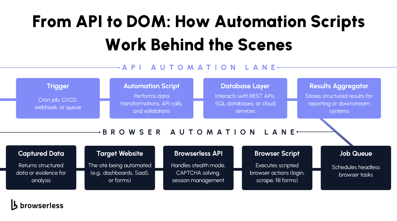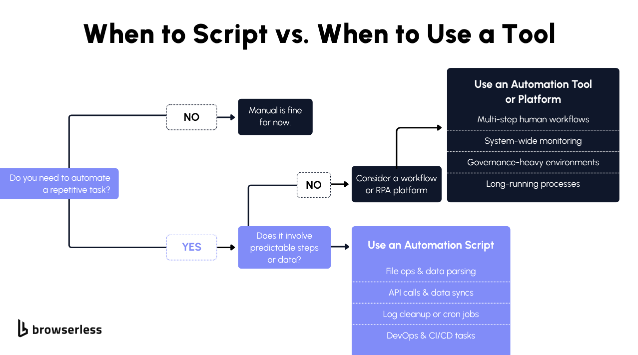 Automation scripts are the quickest way to turn an idea into something that actually saves you time. Instead of wrestling with bulky automation tools or full platforms, a few lines of Python, Bash, or PowerShell can take care of those repetitive, error-prone tasks you’d rather not do yourself. Whether it’s moving files around, calling APIs, checking systems, or automating the browser with Browserless, scripts let you build fast, run anywhere, and stay in control. In this guide, we’ll look at how to use simple, reliable scripts to handle everything from small chores to scalable workflows across data, DevOps, and the web.