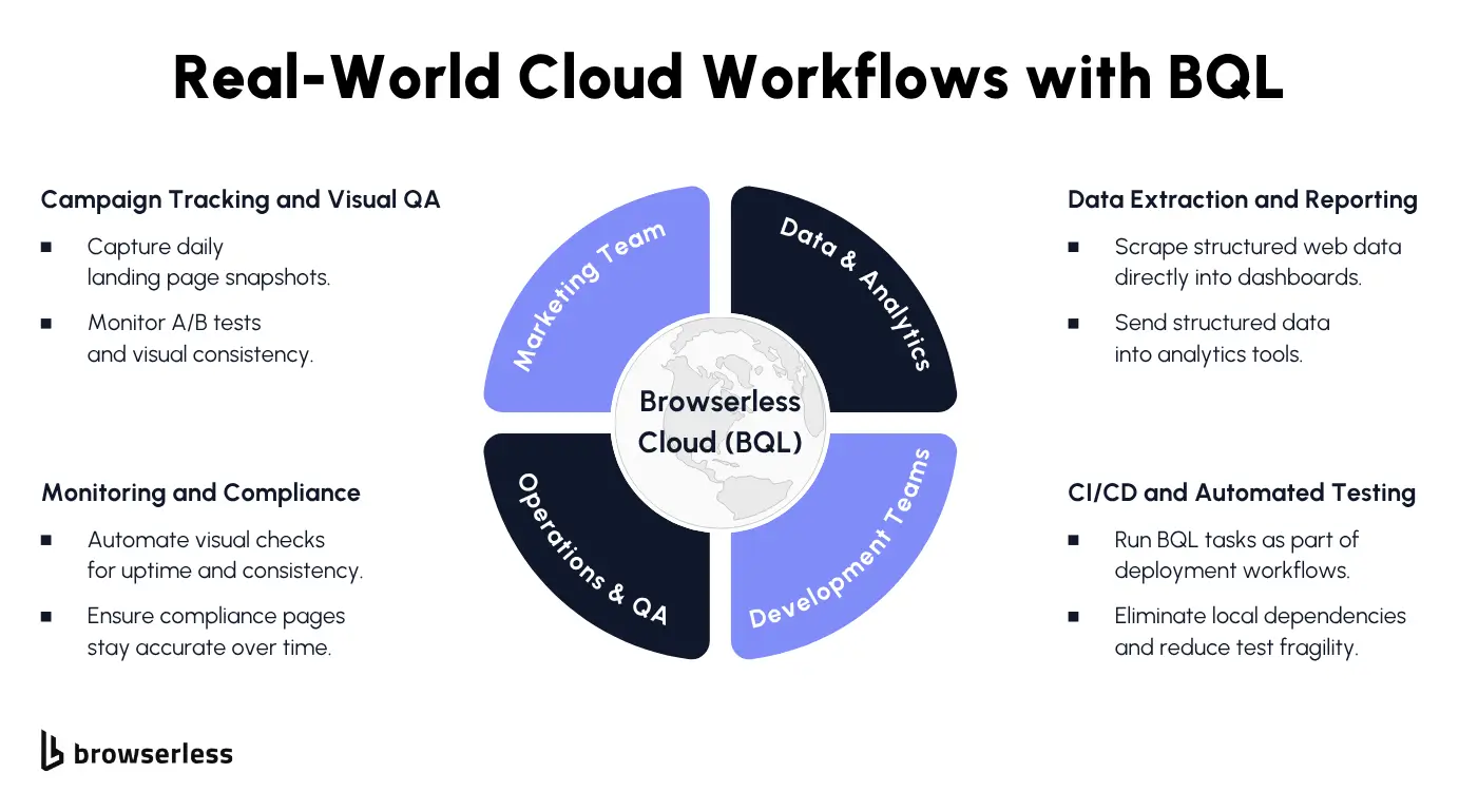 Marketing teams use it for screenshots and website snapshots. Data teams use it to pull content or structured information. Engineering teams use it for CI/CD checks or cloud workflows. Anyone who needs browser actions without running a real browser themselves benefits from it.