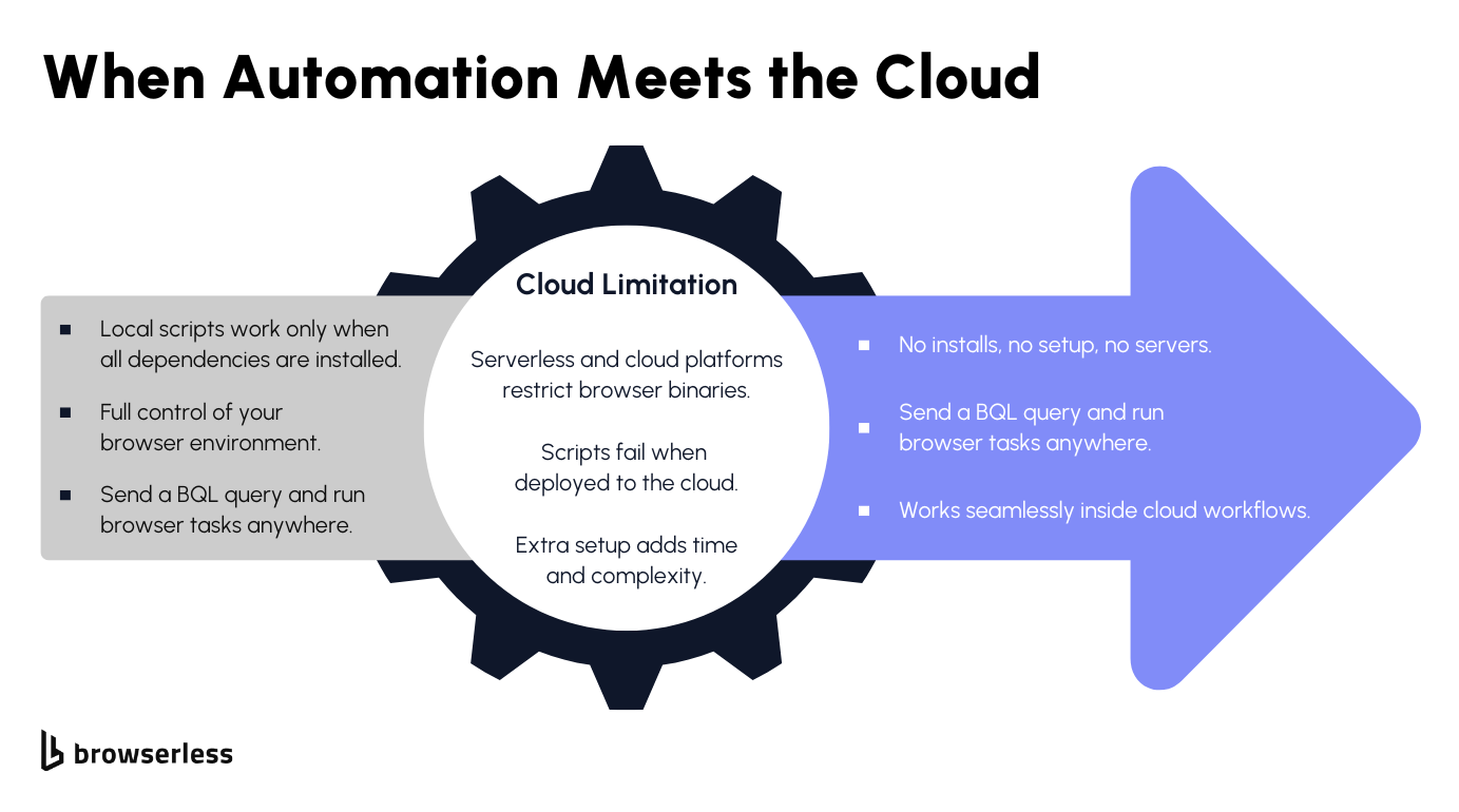 Cloud platforms and serverless functions limit how long tasks can run and what software can be installed. A full browser usually needs more time and system access than these environments allow. This is why a script that works during local testing often fails once deployed.