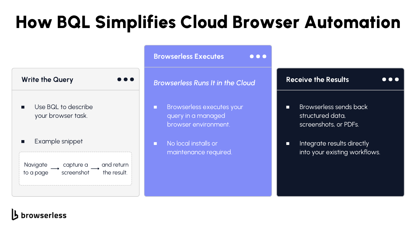 Teams are using cloud platforms more than ever to run automation workflows. When a browser script works on a laptop but behaves differently in the cloud, it can slow things down and create extra work. In this article, you will learn how BrowserQL helps solve that problem. BrowserQL is one of the Browserless APIs that lets you run browser actions via simple API calls without installing or managing a browser yourself. You can trigger navigation, form actions, or content extraction from serverless functions, containers, no-code tools, or AI-driven agents while keeping the browser environment consistent across platforms.