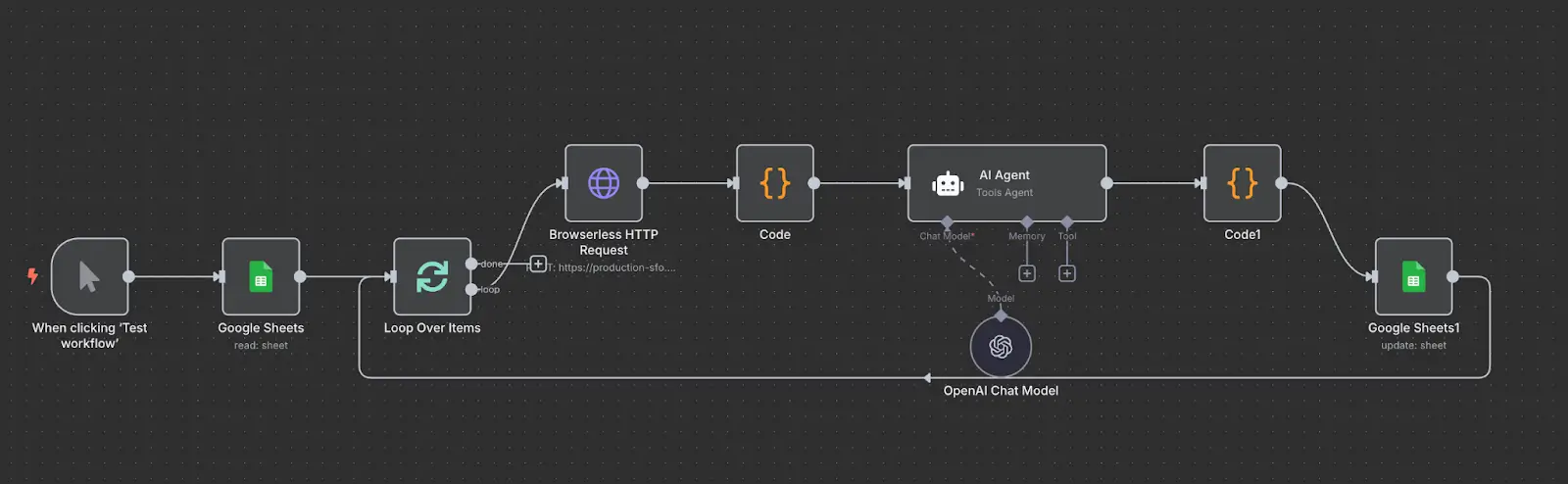 We’ve now walked through two hands-on use cases: scraping product listings with AI-assisted structuring and qualifying B2B leads by parsing company websites. In both, we used Browserless to reliably extract data from modern web pages, n8n to automate the workflow logic, and a language model to reason over the results. This setup enables you to seamlessly transition from raw HTML to clean, structured insights that can be easily integrated into your CRM, Google Sheets, or any downstream system. What stands out here is the adaptability of this stack. You’re not locked into a vertical or a data type; swapping a prompt, adjusting a selector, or rerouting an output is often all it takes to shift use cases. Browserless’s BQL takes the heavy lifting out of scraping. If you’re ready to try this for yourself, sign up for a Browserless account. It’s the quickest way to start building workflows that are reliable, modular, and actually fun to iterate on.
