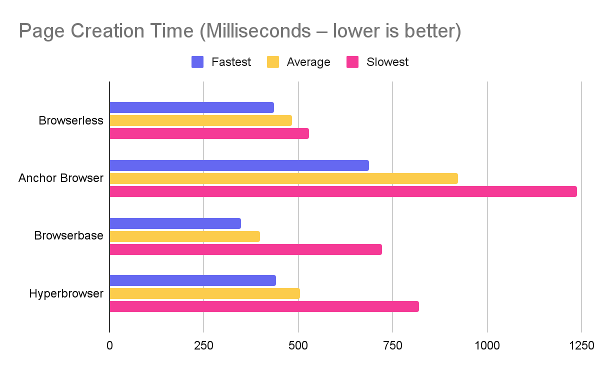 Browserless averaged 482.3ms to create a page vs. Anchor at 923ms.