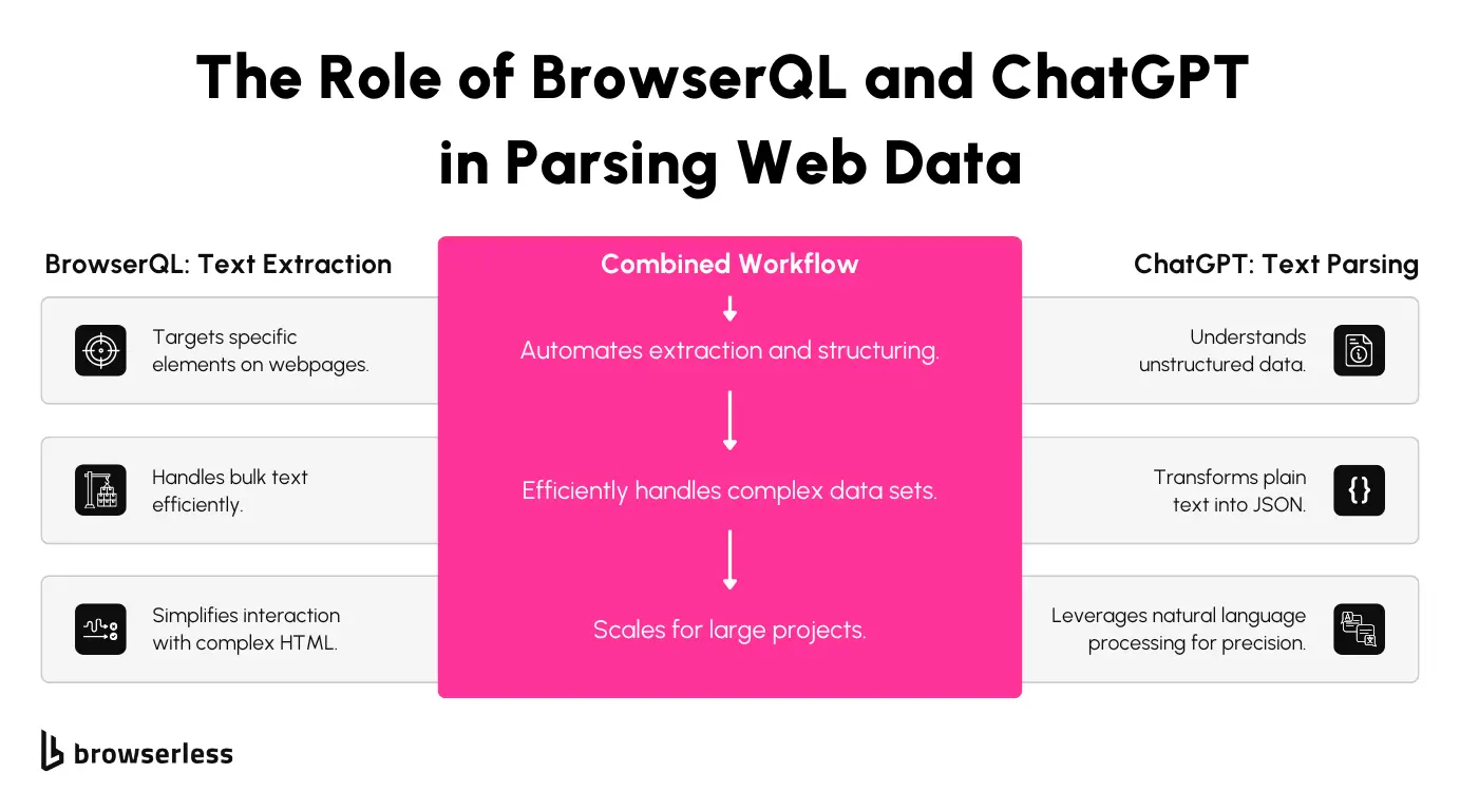 Let’s break down how BrowserQL and ChatGPT work together to seamlessly automate web data extraction and parsing. This step-by-step process takes you from raw web pages to structured JSON outputs, making it straightforward to integrate into your own projects.