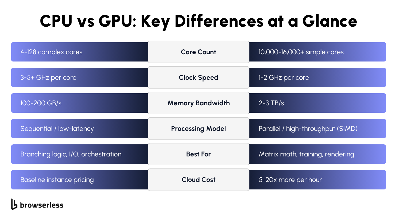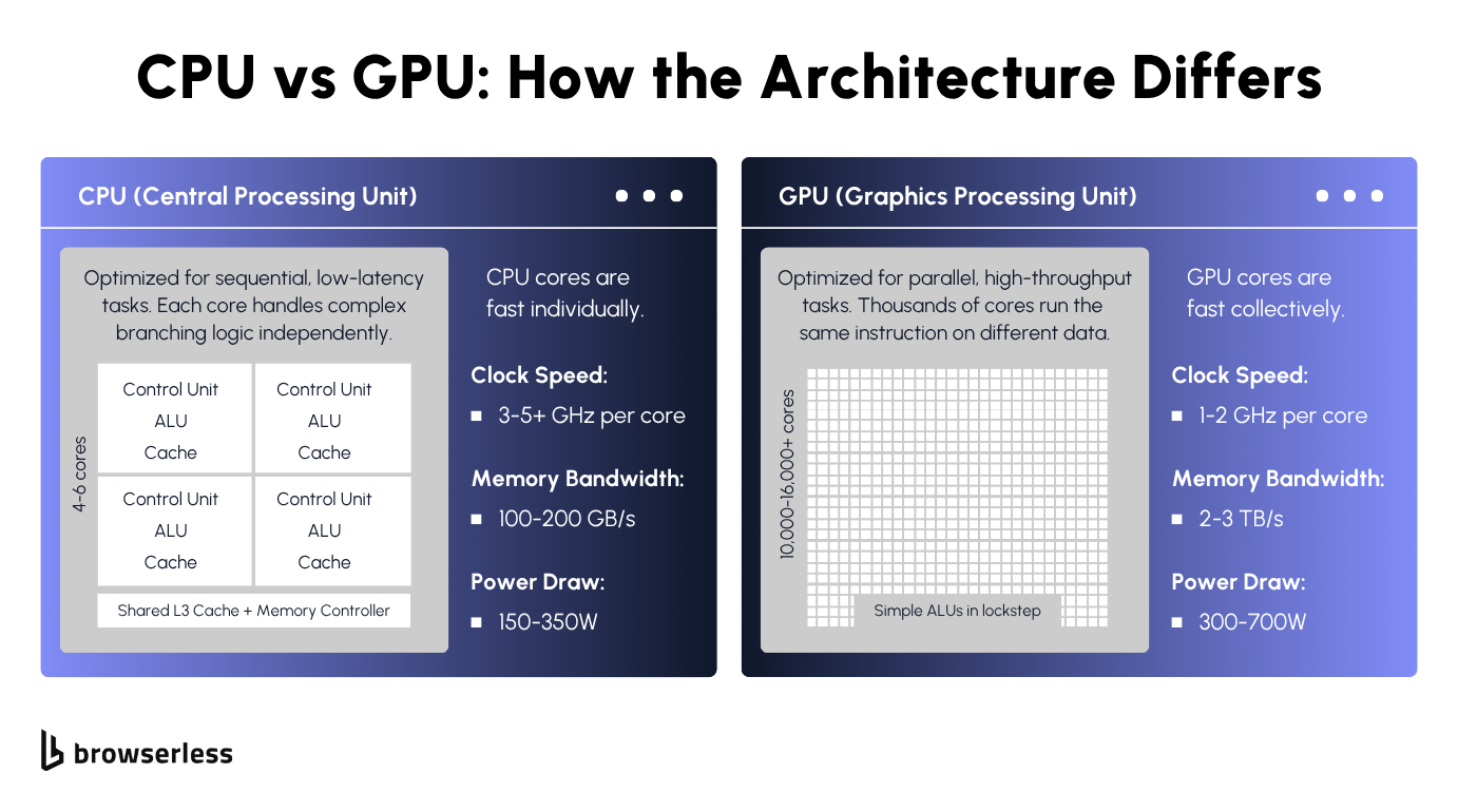 Picking the wrong processing unit costs real money, both ways. Put a CPU workload on a GPU instance, and you pay several times per hour for cores your code never touches. Put a parallel workload on a CPU, and you wait hours for what should take minutes. Headless browser automation sits firmly on the CPU side of the GPU-CPU divide, which is why Browserless runs on CPU-tuned infrastructure. Your GPU quota stays reserved for machine learning model training and inference. Sign up for a free trial and offload your browser automation to infrastructure built for the job.