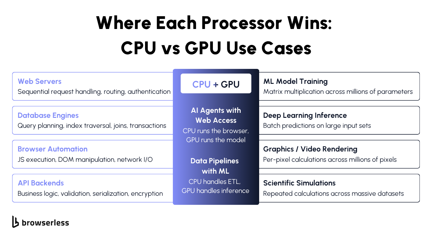 - CPUs win anywhere one step depends on the last: web servers, databases, browser automation, anything with branching.