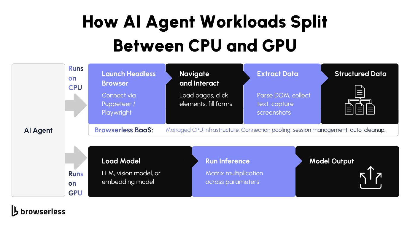 For AI agent architectures that combine language models with web scraping, Browserless takes the browser half off your plate. You're not provisioning a second box of CPU infrastructure to sit next to your GPU model.