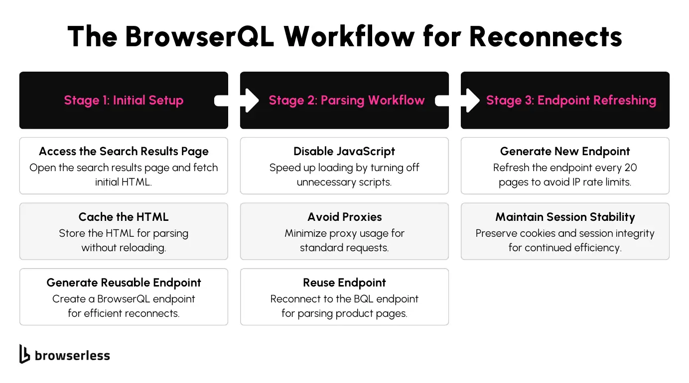 Disabling JavaScript can boost the speed of individual product pages, especially when dynamic rendering isn’t required. Reusing a stable BQL endpoint ensures faster page access while keeping the session state intact.