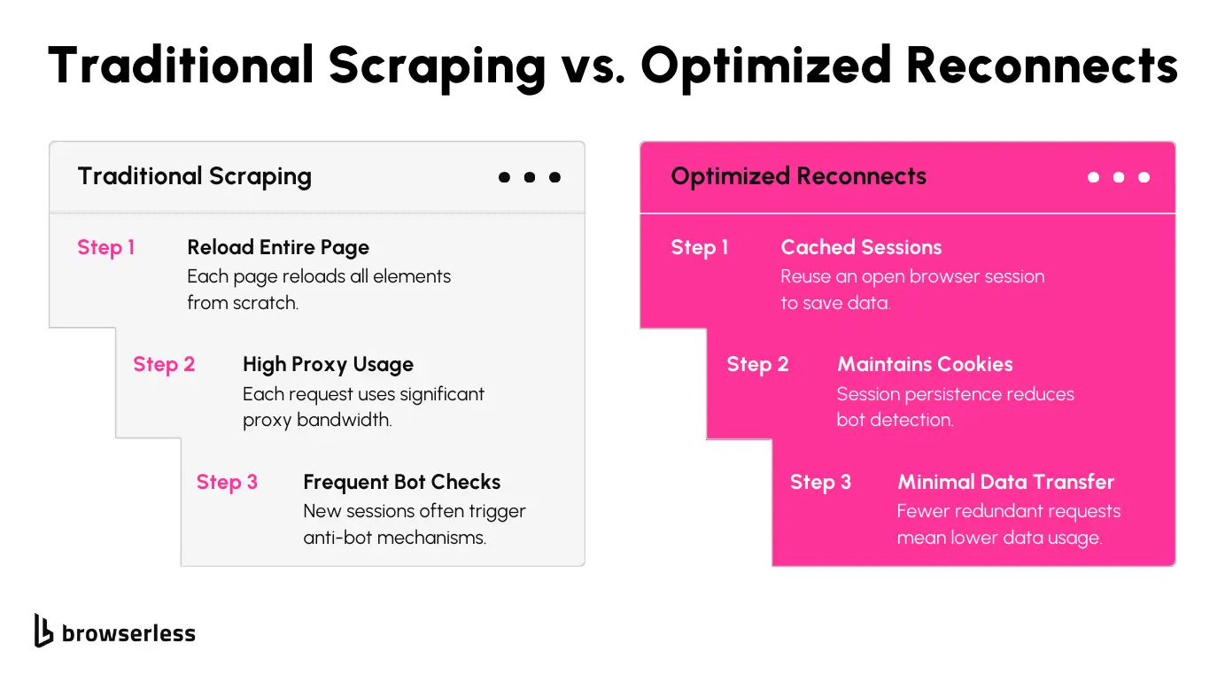 Reconnecting lets scrapers reuse an active session instead of starting fresh each time, saving bandwidth and avoiding repeated logins. BrowserQL's reconnect API keeps sessions open, minimizing proxy requests and reducing detection risks.