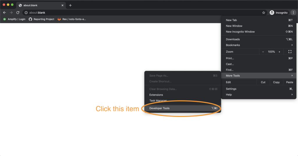Once you're ready, open a new tab. The about:blank page is good as nothing happens on it, keeping everything clean. Once done open devtools.