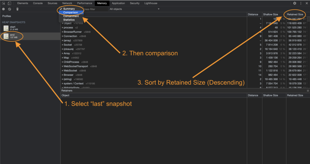 What we're after here is Objects that are growing over time and never collected. In plain language, we're essentially telling Chrome that we want to compare these snapshots, and show us objects that have grown over time and are never collected.