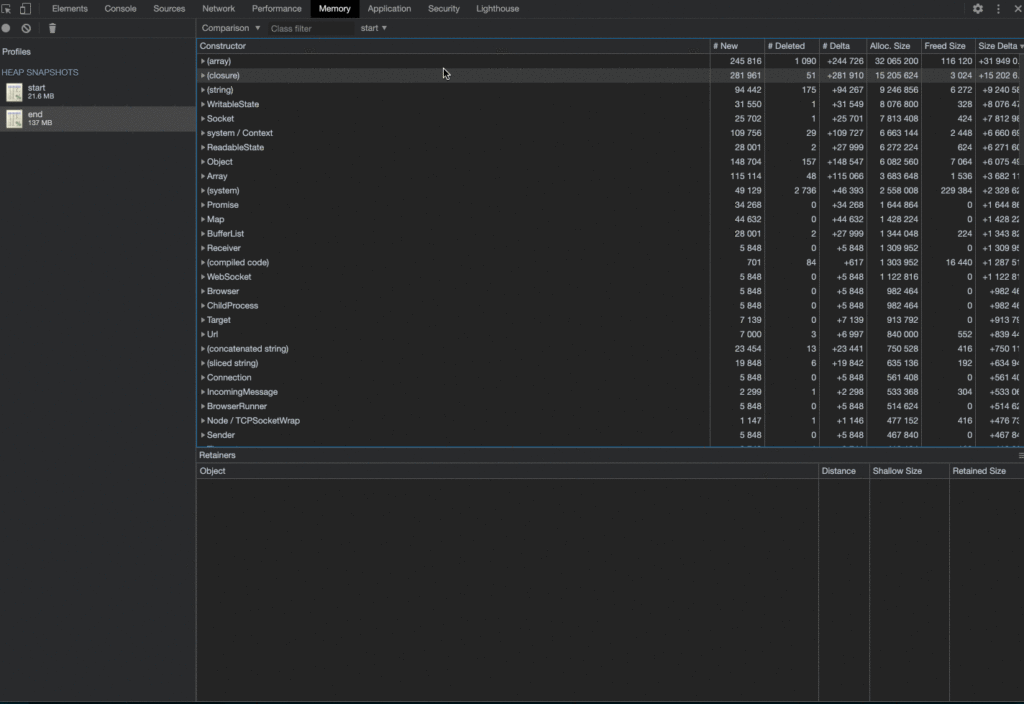 The first thing we reached for was the npm package heapdump. This little utility generates portable heapsnapshot's of V8's heap, which you can then directly import later into Chromium to debug (more on that later).