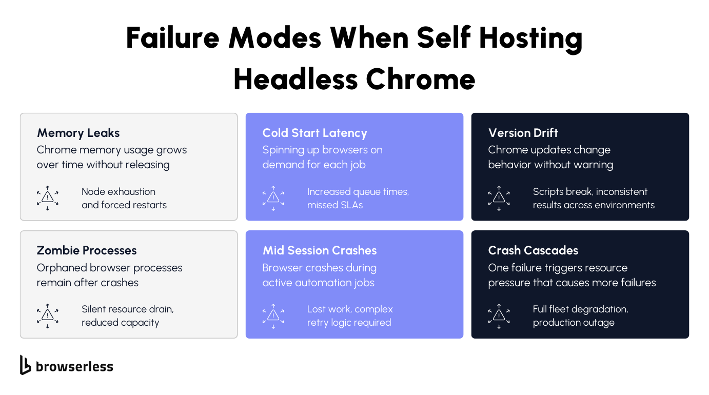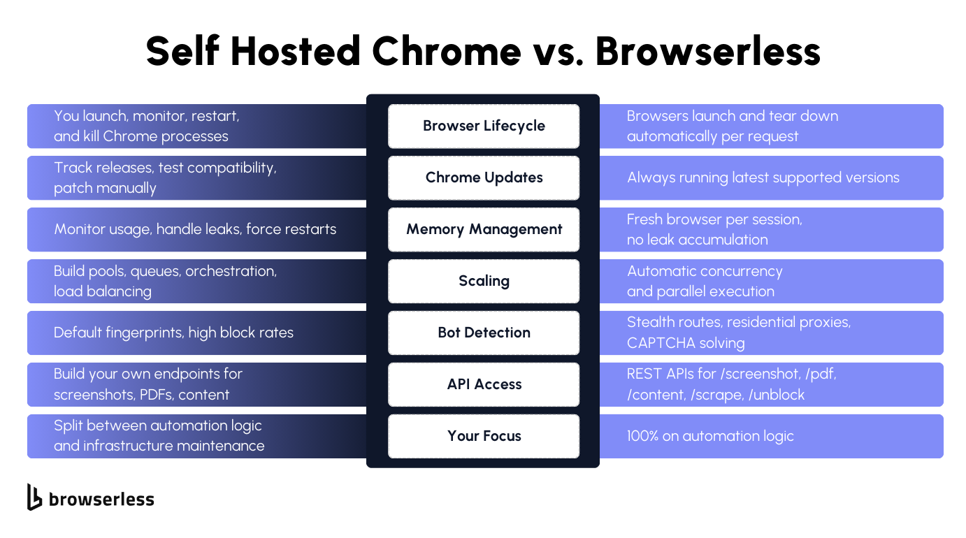 - Self-hosting headless Chrome breaks at scale. Memory leaks, zombie processes, version drift, and crash cascades turn a simple automation script into infrastructure maintenance. Managed services like Browserless handle the browser lifecycle, so you can focus on automation logic rather than keeping Chrome alive.