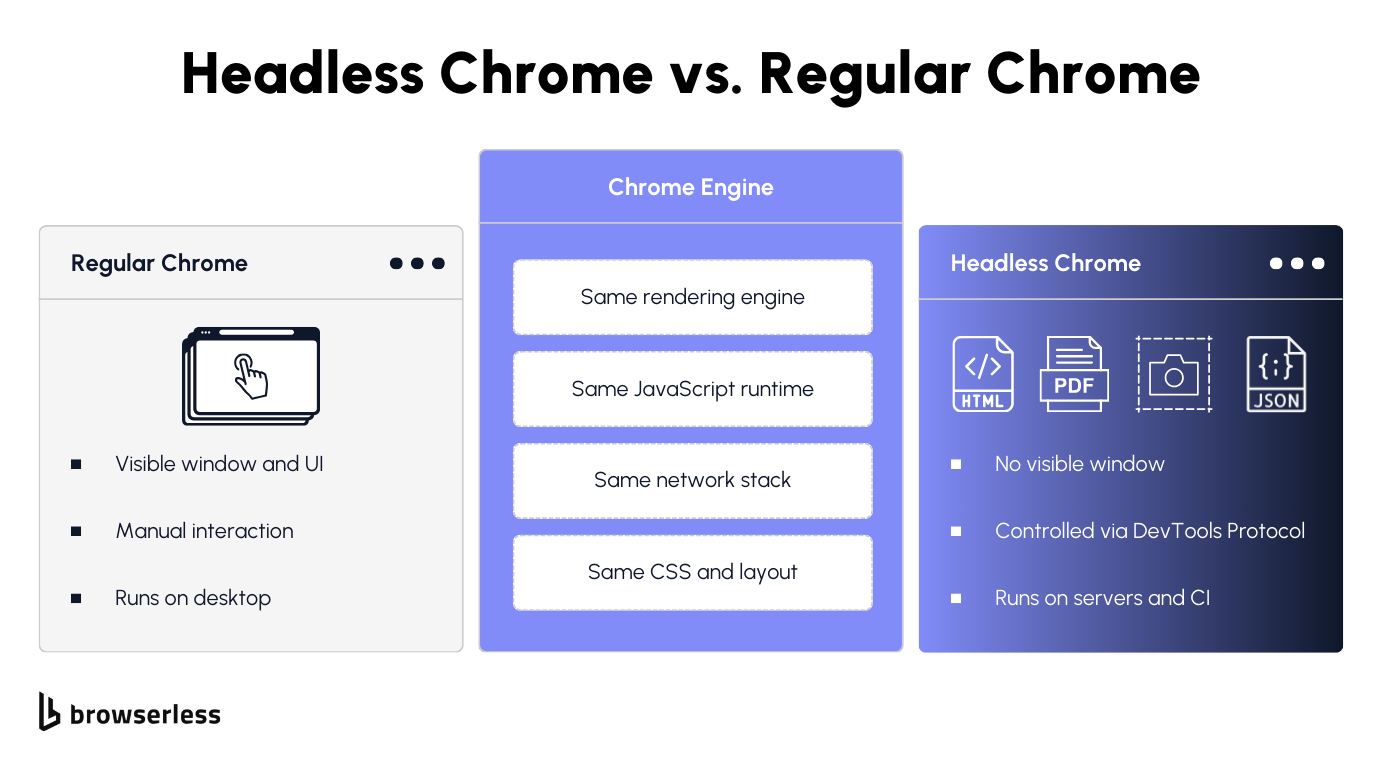 Under the hood, it's still the same rendering engine, JavaScript runtime, and network stack as regular Chrome. Pages render fully, right down to CSS, fonts, and layout calculations. The only difference is that nothing gets drawn to a screen, which is exactly why it's useful: you can run Chrome on servers, CI pipelines, Docker containers, anywhere without a display.