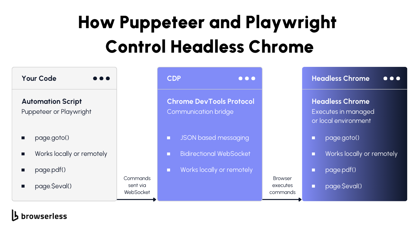 - Puppeteer and Playwright are the standard ways to control it. Both connect to headless Chrome over the DevTools Protocol and give you full control over navigation, interaction, and data extraction. The code is nearly identical whether the browser runs locally or remotely.