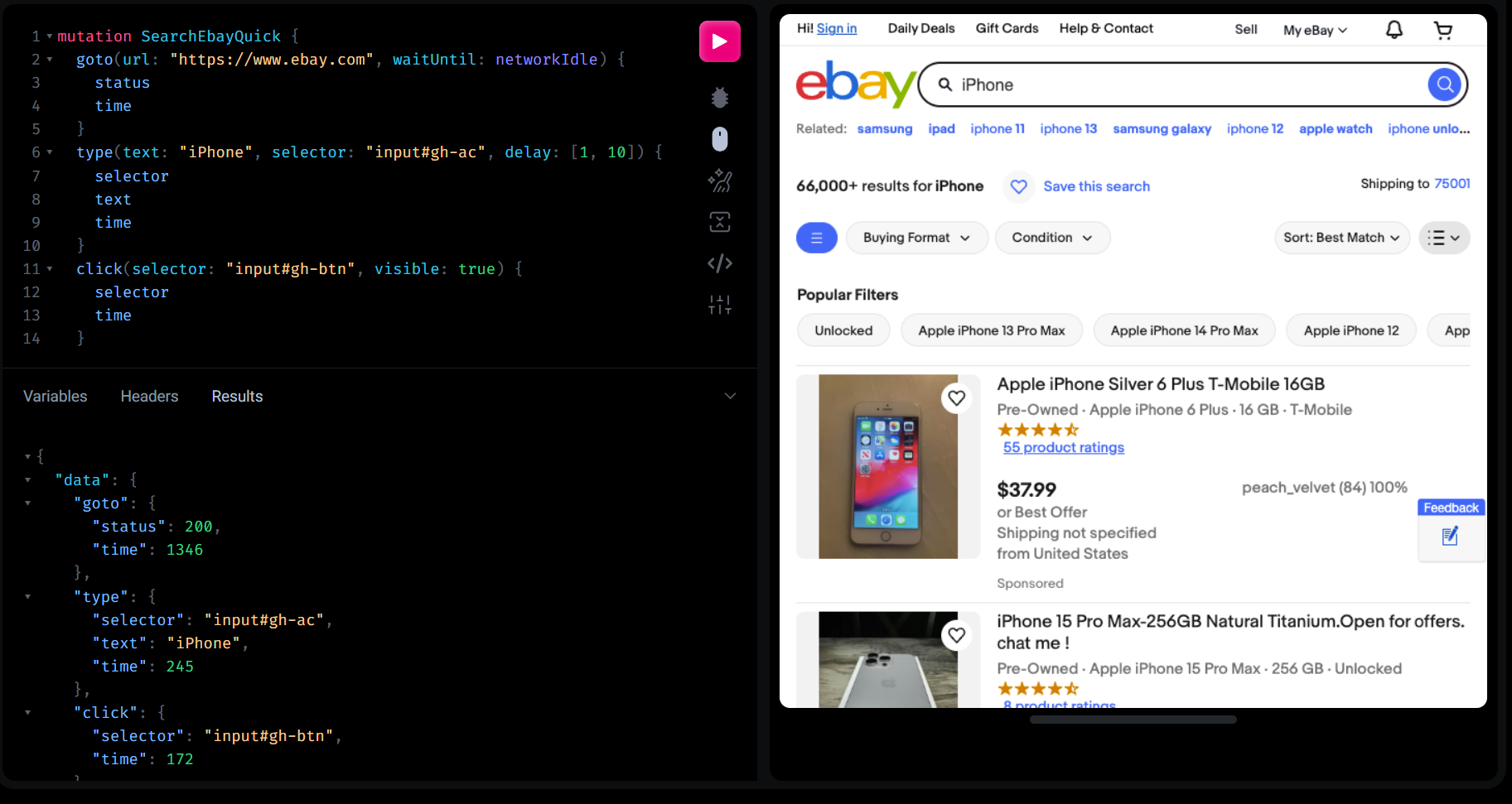 Next, we tell Puppeteer to search for "iPhone" on eBay by interacting with the search bar and button. This mimics what a user would do manually.