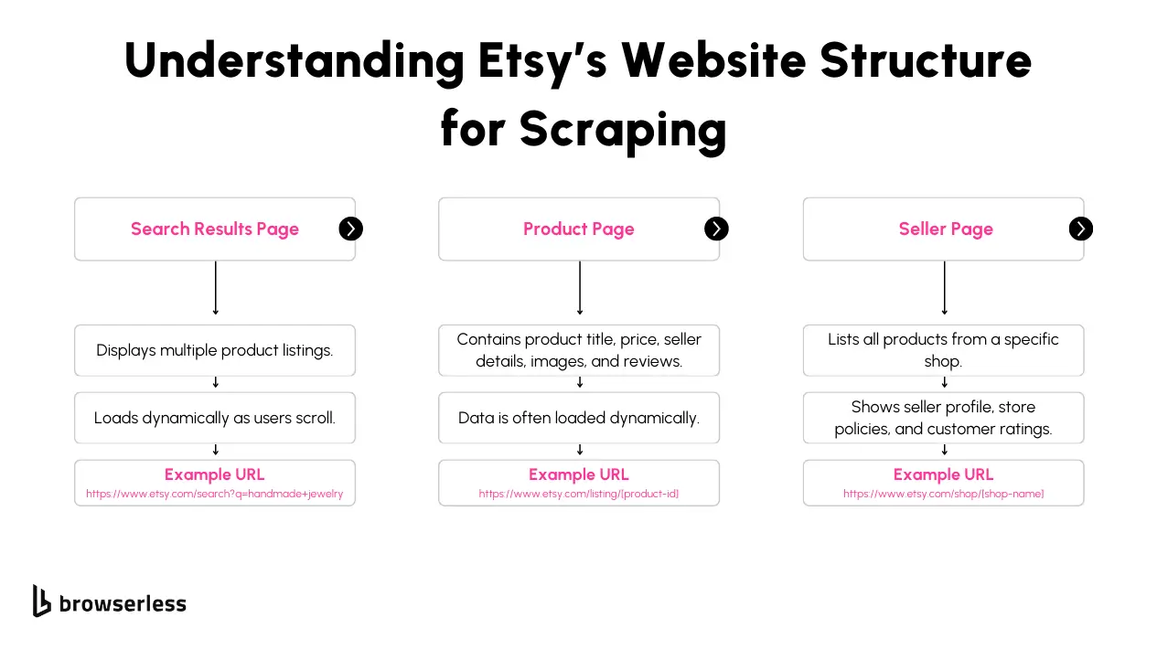 Etsy’s URLs follow a predictable structure, which makes it easier to target the right data when scraping. Here’s how they’re organized: