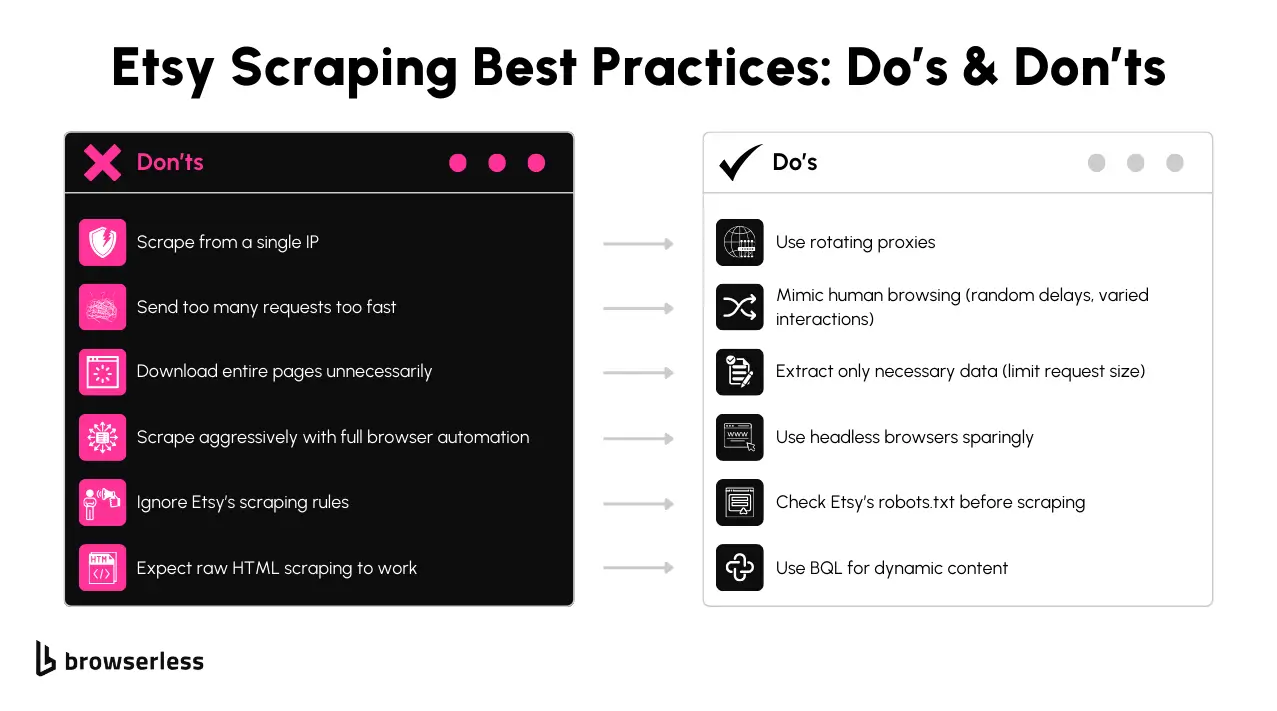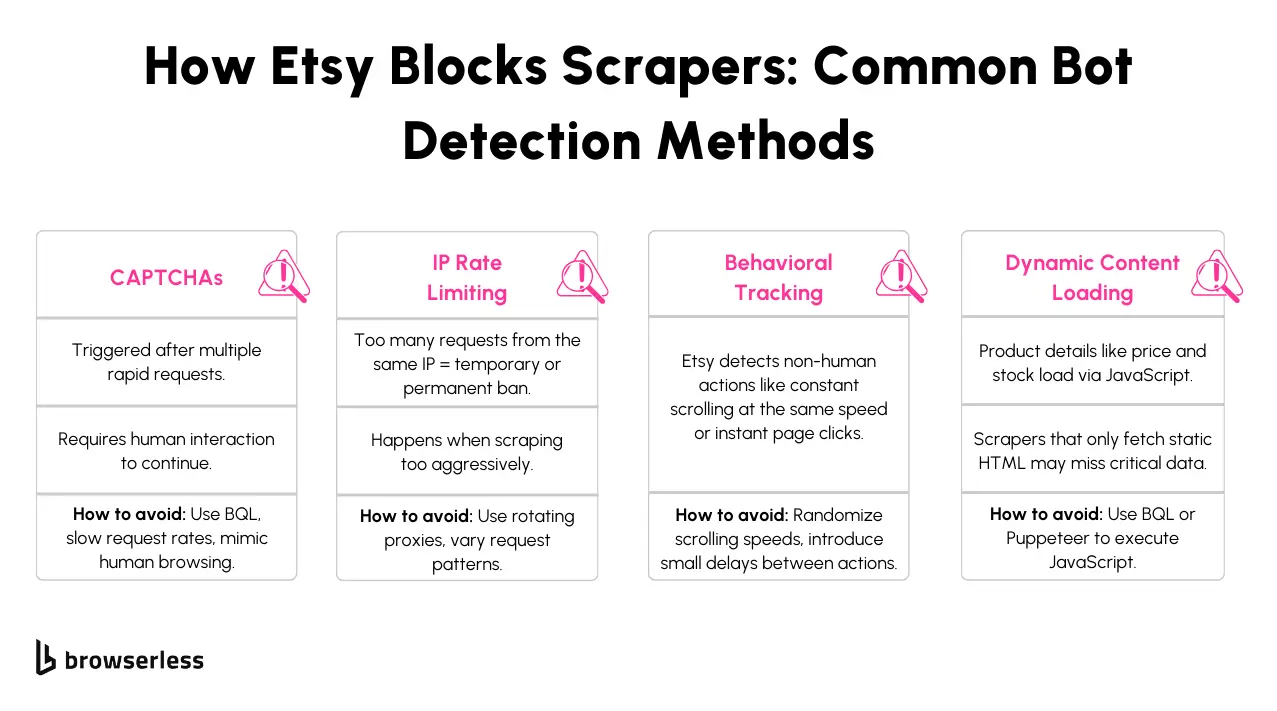 Scraping Etsy presents unique challenges like CAPTCHAs, bot detection, and JavaScript-heavy pages, but using Browserless with BQL helps you easily navigate those obstacles. Instead of manually wrestling with browser automation, you can load pages, extract content, and handle dynamic elements in one streamlined request. Pairing that with smart practices like IP rotation, proxy usage, and headless browsing ensures your scrapers stay effective and undetected. Try Browserless and start scraping Etsy like a pro today.