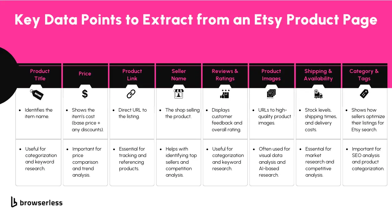 Etsy contains valuable information that can be extracted, including product listings, seller details, customer reviews, pricing, and category data. This data is useful for market research, price tracking, and trend analysis.