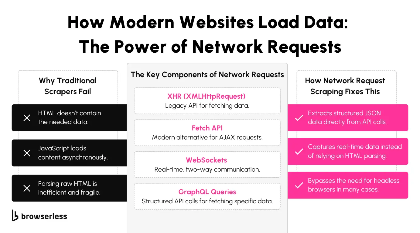 Today’s web applications rely heavily on network requests to deliver content dynamically. Technologies like XHR (XMLHttpRequest), the Fetch API, WebSockets, and GraphQL queries enable websites to load data asynchronously, allowing pages to update without a full refresh.