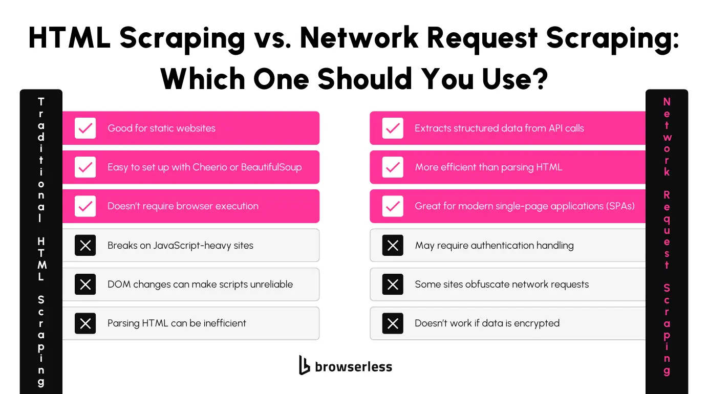Focusing on the network layer can reduce reliance on full-page rendering, improving the speed and performance of your scraping process. Without the overhead of rendering, you can target API endpoints directly, which is often faster and less resource-intensive.